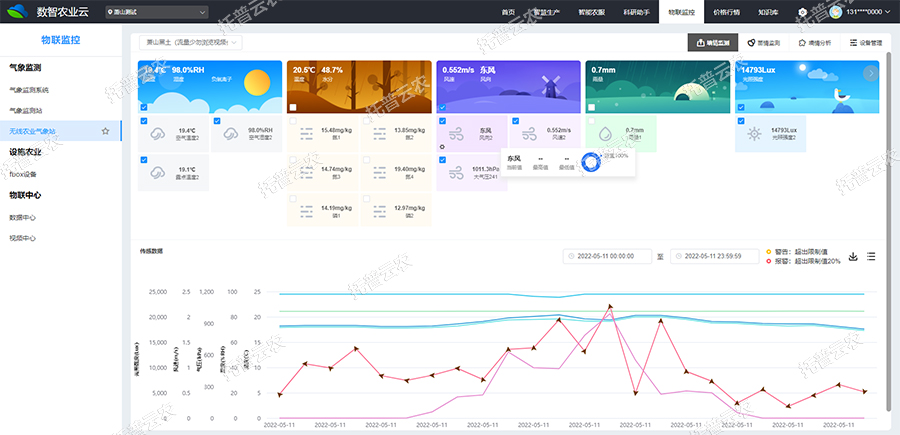 4、超限預警設置:用戶可預置常用作物報警配置,設置最低最高超限值,平臺可自動進行數(shù)據(jù)預警分析。